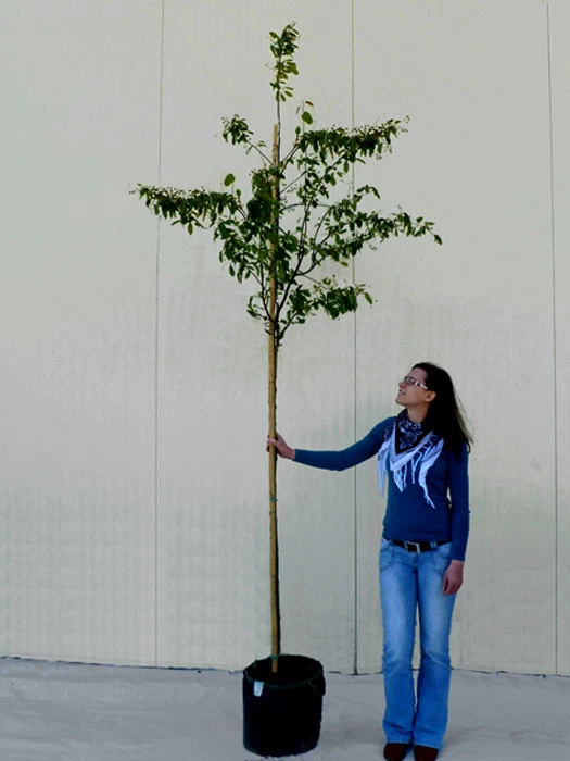 | Lieferqualität: | Junger Hochstamm mit einer Stammhöhe von ca. 1,80m – 2,00m im Container. Mit einer auf dem Stamm aufsitzenden kleinen Krone, die im Lieferzustand fachgerecht etwas zurück geschnitten ist, um eine gute Kronenentwicklung nach der Verpflanzung zu gewährleisten. (Bild 6 zeigt den Baum in der Lieferqualität jedoch vor dem Rückschnitt der Krone.) Stammhöhe: ca. 1,80 m Stammumfang: 8 – 10 cm (in 1 m Stammhöhe gemessen) Gesamthöhe: ca. 2,40 – 2,60 m (Stamm + Krone) |
