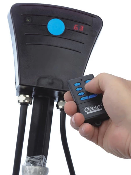 Die besonders leistungsstarken Filterspeisepumpen OASE Aquamax Twin fördern verschmutztes Wasser mit bis zu 11 mm Korngröße. Die überwinterungstaugliche Pumpe hat zwei voneinander getrennt schaltbare Motoreinheiten, die per Funk an- und ausgeschaltet sowie elektronisch gedimmt werden können. Dank der Digitalanzeige am Empfänger ist eine präzise Einstellung der Leistungsstufe möglich.
