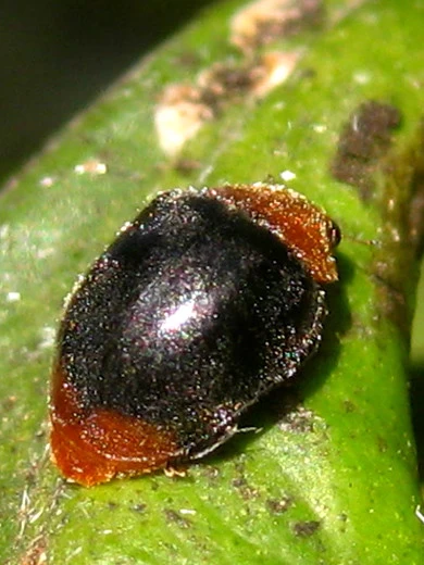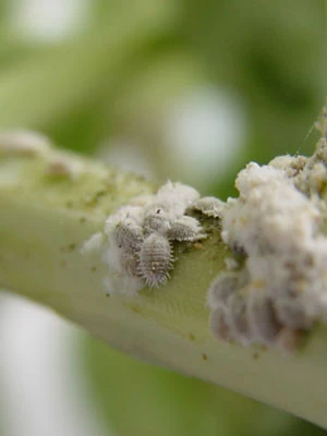 Die Larve des Käfers sieht der Wolllaus sehr ähnlich: weiß bemehlt und wollig. Jedoch wird sie weitaus größer und kann sich schneller fortbewegen.