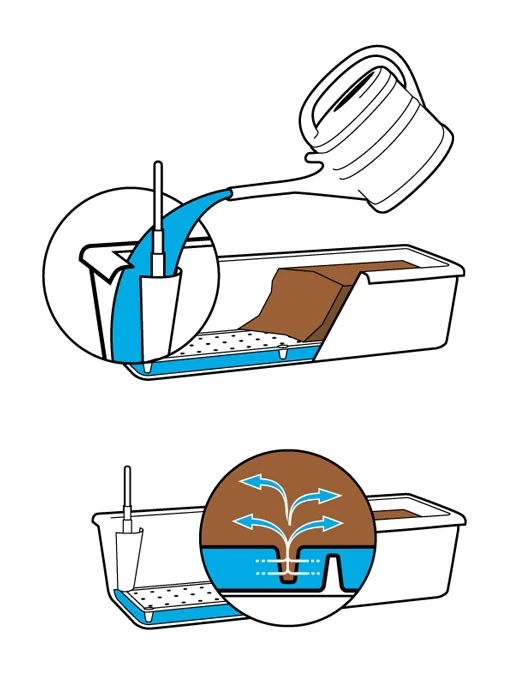 • Überlauföffnung im Wasserspeicher (überschüssiges Wasser – durch zu starkes Gießen oder Regen verursacht – kann ablaufen, dadurch kein Übernässen der Erde).