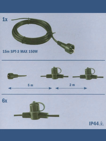 Das 15 m lange Kabel SPT-3 verbindet bis zu 6 Leuchten mit dem dafür vorgesehenen Trafo (Geeignet für 21W bis 300W Transformatoren).