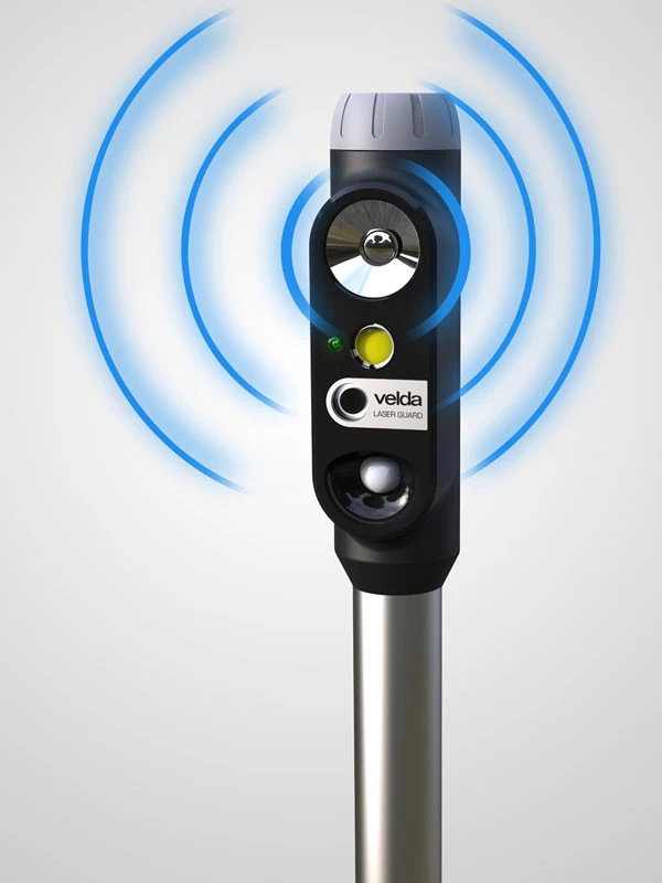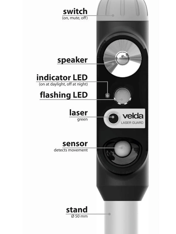 Der Bewegungssensor des Laser Guard detektiert herannahende Eindringlinge und gibt direkt grelle Lichtblitze, grüne Laserstrahlen und optional auch abschreckende Geräusche. Er hat eine Reichweite von ca. 12 m in einem Winkel von 100°. Noch bevor der Reiher am Teichufer landet wird er erschrocken fliehen und sind die Fische im Teich sicher. Die Wirkung des Laser Guard ist sehr effektiv gegen Reiher auf drei verschiedene Arten: