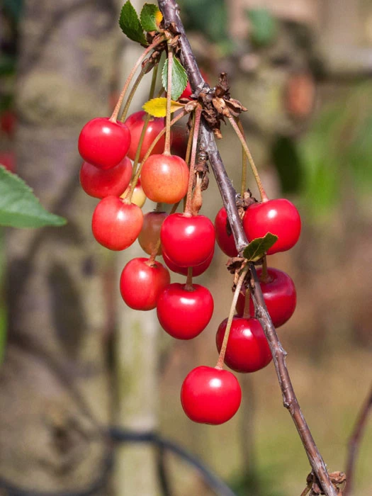 | Frucht: | Mittelgroß; dunkelrot mit stark färbendem Saft; Fleisch mäßig fest, mit feinem Aroma und milder Säure. |