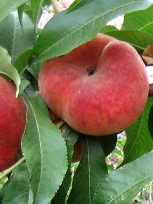 | Frucht: | Flache Fruchtform, gelbfleischig, mit intensiverem Aroma als bei den herkömmlichen, runden Pfirsichen. |