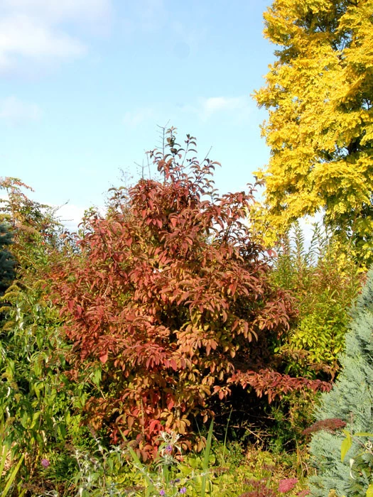 | Wuchs: | Straff aufrecht wachsender, später dicht und sparrig verzweigter Strauch, bis 2,5 m hoch und 2 m breit werdend. Jahreszuwachs 20 – 30 cm. |